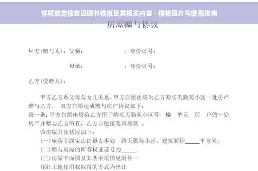 摘要:本文旨在全面解析放弃债务证明书模板及其相关内容,不涉及模板图片。文章将详细介绍放弃债务证明书的概念、作用及重要性,同时解释模板的使用场景和填写要点。通过本文,读者可以了解如何正确使用放弃债务证明书模板,以确保双方权益得到保障。本文旨在为读者提供清晰、简洁的信息,以帮助其更好地理解和应用放弃债务证明书。