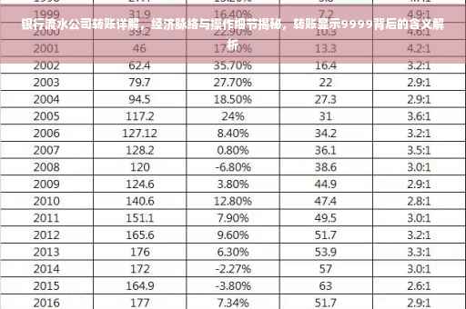 摘要:银行流水中的公司转账反映了经济活动的脉络和操作细节。银行流水公司转账显示9999”的含义,这通常代表某笔交易金额或特定代码。深入分析银行流水中的公司转账,可揭示资金流动的方向、频率和规模,从而洞察企业经营状况、财务状况及市场趋势。了解背后的经济逻辑和操作细节,有助于个人和企业做出更明智的金融决策。