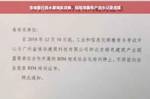 通过本文的介绍,你应该已经掌握了吉林银行流水查询的方法、注意事项以及常见问题解答,在查询流水记录时,请确保个人信息的安全,定期核对交易信息,并妥善保存电子流水记录,如遇任何问题,请及时联系吉林银行客服,希望这篇文章能够帮助你更好地管理个人财务,享受便捷的金融服务。