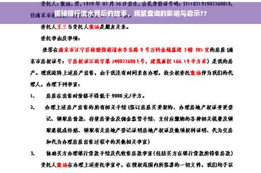 揭秘银行流水背后的故事,频繁查询引发关注。深入了解频繁查询银行流水的影响,包括可能涉及的个人隐私、信用记录等方面。通过此文,读者将了解银行流水的重要性及其对个人财务和信用状况的影响,提醒大家在查询银行流水时谨慎处理个人信息,避免不必要的风险。