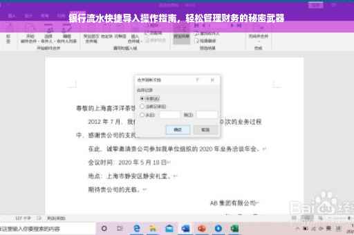 在现代社会,随着金融科技的飞速发展,个人和企业对财务管理的要求越来越高,银行流水作为记录个人或企业资金流动的重要文件,其管理和分析工作日益受到关注,传统的银行流水导入方式往往繁琐耗时,无法满足高效快捷的需求,本文将介绍一种全新的银行流水快捷导入方法,帮助个人和企业轻松管理财务,提高工作效率。