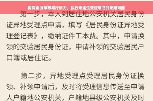 摘要:本文将探讨执行过程中无需生效证明书的情况,探究自由意志与行动力的无限可能。文章将阐述在特定情境下,无需等待生效证明书的束缚,如何释放个人的自由意志和行动力,实现自我价值和目标追求。通过深入探讨这一主题,文章将激发读者对于个人潜能的挖掘和行动力的提升的思考。