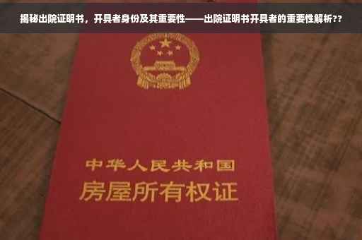 摘要:本文将为您揭秘出院证明书的重要性及其开具者。出院证明书是一份重要的医疗文件,通常由主治医生或医师开具,证明患者已康复并结束住院治疗。本文还将探讨出院证明书是否等同于开具者的问题,并强调其重要性,为患者提供必要的指导。