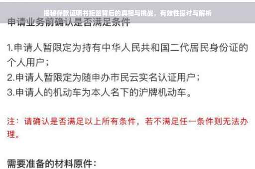 摘要:存款证明书拒签背后的真相涉及多种因素,其有效性引人关注。面对这一挑战,需深入了解拒签原因,包括资信问题、证明材料不齐全等。应寻求专业建议,确保证明材料完备、合规,以提高存款证明书的有效性。这一过程考验申请者的应对能力和法律素养。