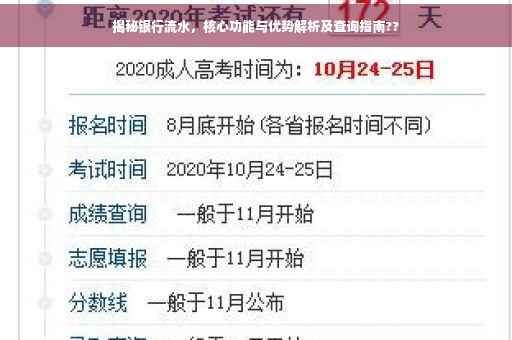 作为信息服务的核心产品,银行流水具有便捷、实时、全面、安全等优势,在个人财务管理、企业财务管理、信贷申请和纠纷解决等方面发挥着重要作用,我们应充分了解并使用银行流水服务,以更好地管理财务和保障金融安全,希望通过本文的介绍,您能对银行流水有更深入的了解,并在实际生活中加以应用。