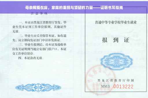 摘要:,,本证明书旨在证明家中母亲因健康问题导致瘫痪在床。家庭面临巨大挑战,但成员展现坚韧力量,共同承担照顾老人的重任。证明内容涵盖母亲的健康状况、卧床情况,以及家庭成员的坚定支持和照顾。此证明旨在展现家庭的实际情况和所需帮助,以表达对母亲的关爱和对家庭坚韧精神的认可。