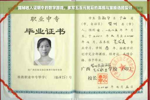 在当今社会,随着经济的快速发展和竞争的加剧,越来越多的人开始关注收入问题,在求职、贷款、申请信用卡等场合,收入证明成为了重要的证明材料之一,一些人会在收入证明上多写五百元,以期达到某些目的,这种做法是否可行?背后隐藏着怎样的真相和策略选择呢?本文将就此展开讨论。