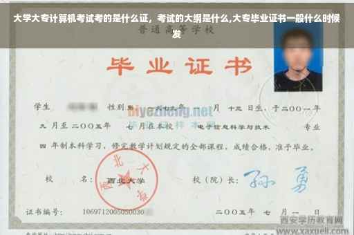 考试分为四个等级,不同等级的内容不同,一级主要考核微型计算机基础知识和使用办公软件及因特网(Internet)的基本技能。一级分为DOS版和Windows版,考核应试者计算机基本知识和使用微机系统的初步能力。考试科目有一级MS Office、一级WPS Office、一级Photoshop,一级共三个科目。一级WPS Office考试内容: (1) 选择题(计算机基础知识和网络的基本知识)。(2) Windows 操作系统的使用。(3) WPS 文字的操作。(4) WPS 表格的操作。(5) WPS 演示软件的操作。(6) 浏览器(IE)的简单使用和电子邮件收发。一级MS Office考试内容: (1) 选择题(计算机基础知识和网络的基本知识)。(2) Windows 操作系统的使用。(3) Word 操作。(4) Excel 操作。(5) PowerPoint 操作。(6) 浏览器(IE)的简单使用和电子邮件收发。一级Photoshop考试内容: (1)单项选择题 (含计算机基础知识部分,Photoshop 知识与操作部分)。(2)Photoshop 操作题(含3 道题目)。大专毕业证一般一般在每年的6月份发放,各个学校时间可能会不一样,但差别不会很大。专科一般指大学专科(高职高专)教育,是我国高等教育的重要组成部分,是大学的学历层次之一。区别于本科,大学专科教育主要由高职(高等职业技术学院)和高专(高等专科学校)承担,部分本科高校亦开设有专科。专科层次不颁发学位,毕业颁发专科毕业证书。高职和高专都属于普通高等教育的专科层次,前者偏技术,后者偏理论,侧重点不同,无本质差别。两者培养目标是统一的,在完成中等教育的基础上培养出一批具有大学知识,又有一定专业技术和技能的高级技术人员,其知识的讲授是以够用为度、实用为本,两者招生是并轨的。