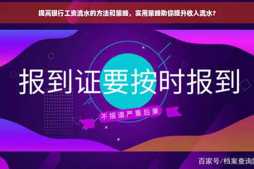 在当今社会,随着经济的不断发展和金融市场的日益繁荣,越来越多的人开始关注自己的财务状况,银行工资流水作为个人经济生活中的重要一环,对于申请贷款、信用卡等金融产品具有举足轻重的作用,如何提高银行工资流水成为了许多人关注的焦点,本文将为大家介绍一些提高银行工资流水的方法和策略,帮助大家更好地管理自己的财务。
