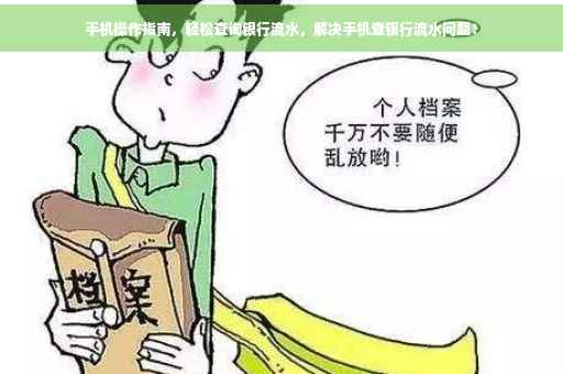 摘要:本操作指南旨在介绍如何使用手机查询银行流水。确保已安装对应银行的手机应用程序并注册登录。进入账户概览或流水查询页面,选择时间范围,即可查看相应期间的银行流水。若手机操作遇到困难,建议联系银行客服寻求帮助。了解如何操作手机查询银行流水,轻松管理个人财务。