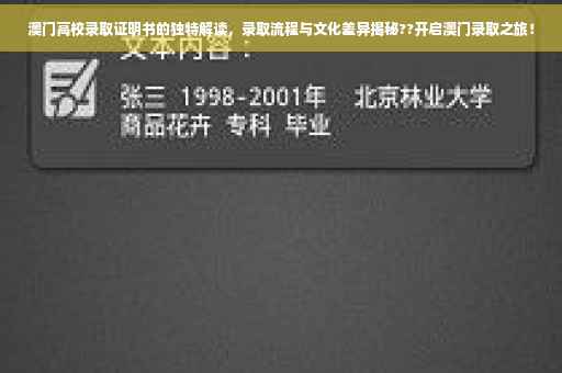 随着内地学生赴澳门学习的需求不断增长,了解澳门高校的录取流程和文化差异变得尤为重要,本文将详细介绍澳门高校录取证明书的独特性,以及申请澳门高校时需要注意的要点,帮助即将赴澳门求学的学子们更好地适应和融入当地的学习生活。