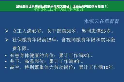 摘要:,,本文将探讨国籍退籍证明书的故事与意义。介绍退籍证明书的背景,包括个人或团体因各种原因选择放弃原有国籍的过程。文章还将阐述如何撰写退籍证明书,包括必要的信息要素和格式要求。将探讨退籍背后的深层原因和可能带来的影响,以及这一过程对个人身份认同和国家归属感的考量。本文旨在帮助读者更深入地理解国籍退籍证明书的重要性及其实践操作。