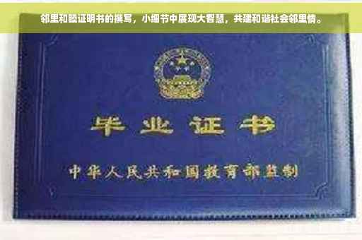 摘要:,,邻里相处和睦证明书是构建和谐社会的重要一环。撰写证明书时,应重视细节,展现智慧。内容包括对邻里关系的描述,如相互尊重、关心照顾、共同维护社区环境等。强调和睦相处的重要性,体现邻里间的友好互助精神。通过撰写证明书,促进邻里间的交流与理解,共同营造和谐宜居的社区环境。