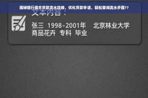摘要:本文将揭示银行组合贷款的流水操作,教你如何查询和管理你的贷款流水,以优化贷款申请。通过了解组合贷款的流程,你将学会如何整理资料,提高贷款成功率。本文还将分享如何优化贷款申请,降低贷款利率和缩短贷款期限。助你轻松应对银行组合贷款流水问题,顺利获得贷款。