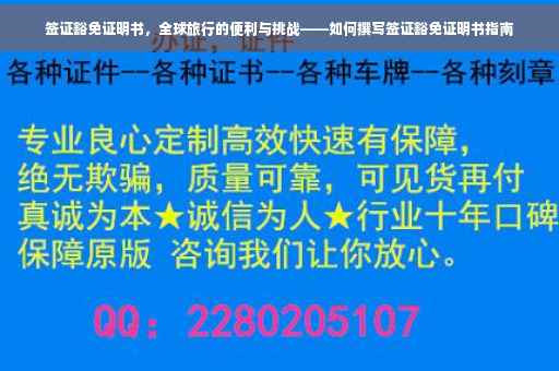 摘要:签证豁免证明书为全球旅行带来便利,减少签证申请流程,但亦伴随挑战。该证明书需详细阐述豁免原因、适用国家及期限等。撰写时需注意格式规范、准确无误。本文将介绍如何撰写签证豁免证明书,包括关键信息和注意事项,以便顺利享受全球旅行的便利,同时应对可能遇到的挑战。