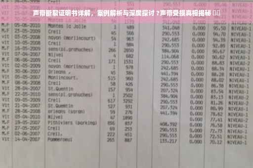 摘要:本文是一份关于声带断裂的详细证明书,结合具体案例进行深入解析与探讨。文章介绍了声带受损的情况,包括声带断裂的原因、症状、诊断和治疗等方面。通过案例解析,详细阐述了声带受损对患者的影响,并探讨了声带断裂的预防措施和康复治疗方法。本文旨在为声带受损患者提供全面的了解和指导,帮助他们更好地应对声带受损问题。