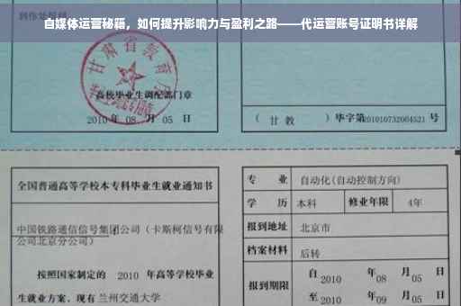 随着互联网的发展,自媒体行业迅速崛起,越来越多的人投身于自媒体创作中,如何提升自媒体影响力并实现盈利成为了众多自媒体作者关注的焦点,本文将围绕证明书代运营账号这一主题,探讨自媒体作者如何提升影响力和实现盈利,帮助读者更好地把握自媒体发展的机遇。