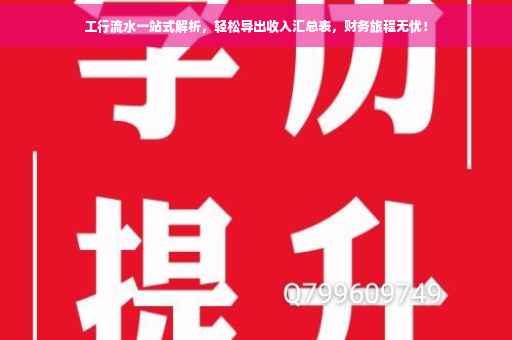 摘要:工商银行提供便捷的一站式服务,轻松导出银行流水,助你全面解析财务旅程。通过简单操作,即可生成收入汇总表,清晰展示你的资金流向。想知道如何导出收入汇总表吗?工行导银行流水服务帮你实现,轻松管理个人财务,让你的财务旅程更加顺畅。