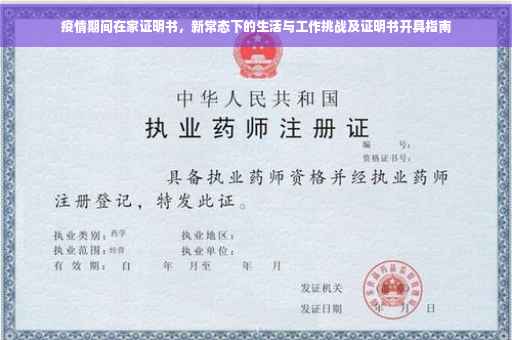 摘要:疫情期间在家证明书是证明个人在家办公的有效证明,反映了新常态下生活与工作的挑战。开具此证明书需遵循一定流程和规范,包括明确证明目的、填写个人信息、工作情况及健康状况等。本文旨在介绍如何正确开具疫情期间在家证明书,以应对新常态下的生活与工作挑战。