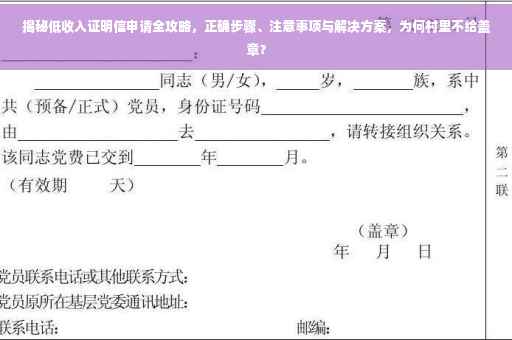 摘要:本文将介绍低收入证明信的申请流程和注意事项,同时探讨为什么一些地方不给盖章的问题。文章指出,正确申请低收入证明信需要提供真实有效的证明材料,并遵守相关规定。也需要注意一些细节问题,如证明信的格式、内容真实性等。针对部分地区不给盖章的情况,文章将探讨可能的解决方案,帮助需要申请低收入证明信的人们顺利获得证明。