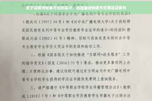 摘要:,,本文探讨了证明书的快递方式选择问题。针对不同类型的证明书和不同的寄送需求,选择合适的快递方式至关重要。文章将分析各种快递公司的服务质量、时效和安全性,以及成本因素,探讨哪种快递方式更适合证明书寄送,以确保证明书能够安全、快速地送达目的地。