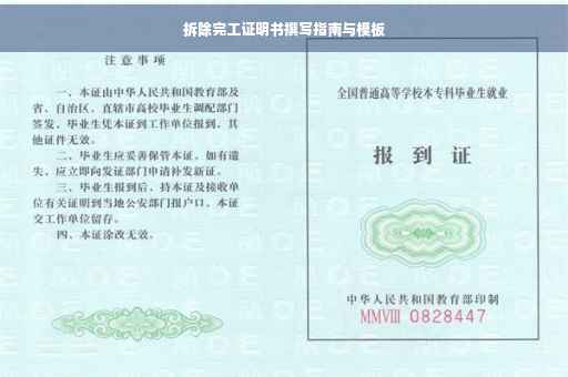 摘要:关于拆除完工证明书,其格式应正式且清晰。内容包括项目名称、拆除地点、施工单位、施工负责人、完工日期等基本信息,并重点阐述拆除工作已按照相关标准和要求完成,现场已清理整洁,不存在安全隐患。最后由施工单位负责人签字并加盖公章,以证明拆除工作已圆满完成。具体撰写时,应确保信息准确、语言简洁明了。