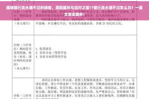 摘要:本文探讨了银行流水通不过的问题,揭示了背后原因并给出了应对之策。文章指出,银行流水通不过可能是由于多种原因造成的,如收入不稳定、支出过高或存在不良信用记录等。针对这些问题,文章提出了相应的解决方案,包括调整个人财务计划、增加收入或优化支出等。本文旨在帮助读者解决银行流水通不过的难题,更好地管理个人财务。