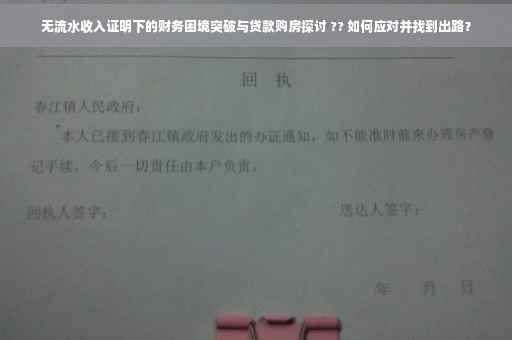 摘要:面对没有流水和收入证明的财务困境,个人需冷静应对并寻求出路。无法仅凭无流水无收入证明贷款购房,需考虑其他途径积累资金。建议通过副业、投资等方式增加收入,同时合理规划和节约开支。寻求专业财务建议,探索适合自己的解决方案。