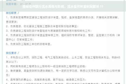 摘要:本文将揭示亳州银行流水背后的真相及其影响。文章指出,亳州银行流水操作需要一定时间,具体时长因不同情况而异。流水操作的真实性和影响也备受关注,需引起广大客户重视。本文旨在帮助客户更好地了解亳州银行流水,以便做出明智的决策。