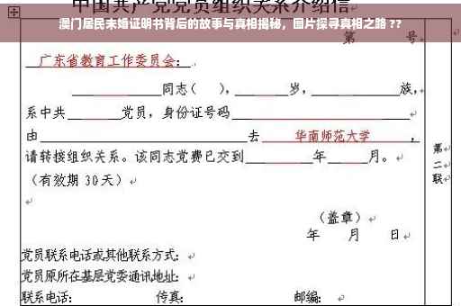 摘要:本文将探讨澳门居民未婚证明书的背后故事与真相,介绍该证明书的含义和作用。将提供相关的图片资料以便读者更好地了解。未婚证明书是证明个人未婚状态的重要文件,对于婚姻、购房、出国等方面都有重要作用。通过本文的探究,读者可以更加深入地了解澳门居民未婚证明书的相关内容。