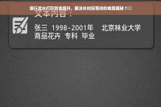 近年来,随着金融行业的迅猛发展和银行业务量的持续增长,银行流水打印作为办理贷款、核对账单等场景的关键环节,其效率问题逐渐受到广泛关注,许多客户反映,在银行打印流水时面临长时间等待的困扰,这不仅影响了客户的办事效率,也降低了银行的服务质量,本文将深入分析银行流水打印耗时长的现状、原因,并提出针对性的解决方案,以期改善这一状况。