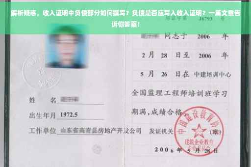 摘要:关于收入证明是否需要写负债的问题,文章解析了疑惑。收入证明中是否需要写负债取决于具体情况,但建议在写负债时注明负债的来源、种类和还款情况等细节。文章提供了关于如何撰写收入证明中负债部分的建议,帮助读者更好地理解和处理这一问题。