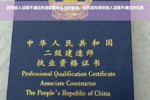 摘要:房贷收入证明不通过的原因可能包括收入证明不真实、收入不足或信用记录不良等。面对这种情况,首先需要了解具体原因,然后采取相应的应对策略。如核实收入证明信息,增加共同贷款人提高贷款额度,或者寻求其他贷款机构等。同时保持良好的信用记录,合理规划个人财务,有助于顺利获得房贷。
