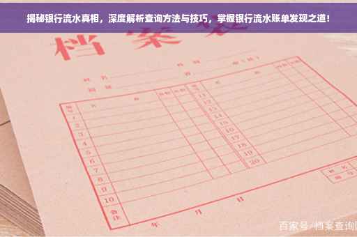 摘要:本文将深度解析银行流水查询方法与技巧,教你如何发现银行流水的真相。通过掌握正确的查询方式、注意事项和技巧,你将能够更准确地了解银行流水账单中的每一笔交易。本文旨在帮助你轻松掌握银行流水查询的诀窍,让你的财务规划更加明晰。