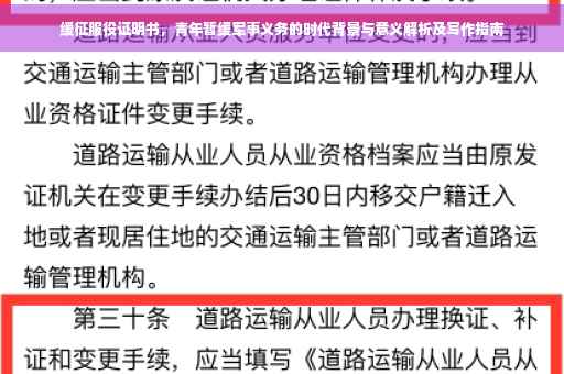 在我国,缓征服役证明书作为一种特殊的军事证明文件,承载着重要的社会意义,随着时代的进步和青年缓征服役政策的实施,这一政策逐渐成为了国家军事战略调整和社会变迁的必然产物,缓征服役政策的出台,旨在更好地平衡国家军事需求与青年个人发展的需求,为青年提供更多的发展机遇和选择空间,本文将带您深入了解缓征服役证明书的重要性、申请条件、办理流程以及相关政策调整等内容,帮助您更好地理解和把握这一政策。