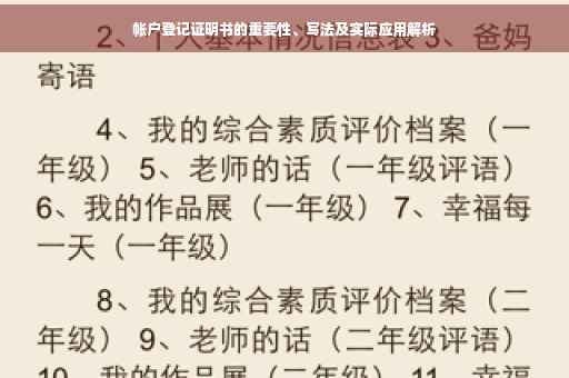 帐户登记证明书在个人生活、企业运营以及国际贸易等领域具有广泛的应用,了解帐户登记证明书的作用、意义及办理流程,对于个人和企业来说都至关重要,希望通过本文的介绍,读者能更好地了解和使用帐户登记证明书,为日常生活和工作中遇到的各类问题提供便利。