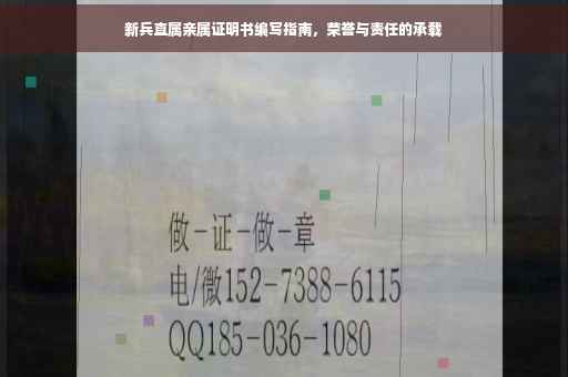 摘要:新兵直属亲属证明书是一份关于荣誉与责任的证明文件,用于确认新兵与亲属之间的关系。编写该证明时,应简洁明了地阐述证明的目的和内容,包括新兵的姓名、身份证号、与亲属的关系、亲属的基本信息等。内容需真实有效,格式规范,以体现证明的权威性和可信度。这份证明对于新兵及其家庭具有重要意义。