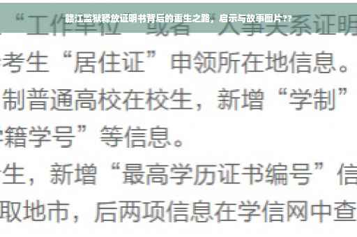 摘要:赣江监狱释放证明书背后隐藏着囚犯们重生的故事。这些囚犯经历了漫长的刑期,通过努力改过自新,最终获得了自由。释放证明书的图片记录了他们人生的重要时刻,也传递出监狱在帮助他们重新融入社会方面的积极作用。这些故事给人们带来启示,即给予囚犯改过自新的机会,同时也是对生命和自由的珍视。