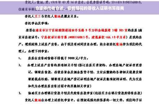 自媒体作者在疫情期间自述无收入状况,关于如何撰写证明疫情期间未有收入的文案,摘要如下:,,本文档旨在证明在疫情期间,自媒体作者因各种原因导致无法正常工作并获得收入。由于疫情的影响,各行各业均受到严重冲击,自媒体行业也不例外。本人在此期间无法外出采访、拍摄及撰写文章,因此没有产生任何收入。本声明旨在真实反映作者在疫情期间的经济状况。特此证明。