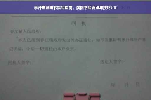 摘要:手汗症证明书应详细记录患者的手汗症状,包括症状的持续时间、频率和严重程度等。病例描述应包含患者基本信息,如姓名、性别、年龄等,以及症状的详细描述,如手掌多汗、伴随症状等。还应记录相关的医学检查结果和治疗过程,包括治疗方法的选择和治疗效果的评估。该证明书应由专业医生出具,并签署姓名和日期,以确保其真实性和有效性。摘要字数控制在100-200字左右。