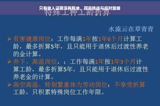 摘要:面对只有收入证明而没有税单的情况,个人或企业需深入了解背后的原因并采取相应措施。这种情况可能涉及多种现实挑战,如税务管理不善、收入证明真实性存疑等。解决之道在于加强财务管理,确保税务合规,同时寻求专业税务咨询以规避潜在风险。还需关注个人或企业的经济状况,确保收入来源合法稳定。这一过程对个人和企业的发展至关重要。