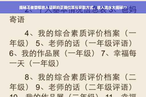 摘要:本文介绍了王者荣耀游戏中收入证明的正确位置与获取方式。文章详细阐述了如何通过游戏内的任务、活动以及社交媒体等途径获取收入流水,帮助玩家更好地了解自己的收入来源并合理规划个人财务。文章强调了理性消费的重要性,提醒玩家避免盲目跟风,确保游戏收入的合理性和可持续性。