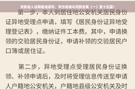 摘要:本系列包含从第一篇至第十五篇的贷款收入证明写作指南。提供关于如何撰写不同类型的贷款收入证明的专业建议和精选范例,旨在帮助读者了解如何准确、清晰地证明自己的贷款收入状况。这一系列内容丰富,涵盖了从准备材料到撰写完成的整个过程,是贷款申请者的必备参考资料。