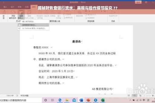 随着金融行业的快速发展,银行业务已成为人们日常生活中不可或缺的一部分,在这个过程中,银行流水作为记录个人或企业资金流动的重要文件,越来越受到关注,特别是在财务领域,银行流水的作用日益凸显,本文将详细介绍财务查银行流水的背景、目的以及具体操作流程,帮助大家更好地了解这一过程。