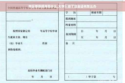 毕业证书是指学生符合毕业资格后,由学校发给的学历证明文件。大学以上符合条件者同时也获得相应的学位证书。不同于学士学位证书,每个学校的模版大体相同,毕业证书在其设计上有一些学校的自主性。毕业证书是报考更高阶学位(如攻读硕士、博士等)及求职时常需要检附的文件。是具有正式学籍的学生,学完教学计划规定的全部课程,考试及格或修满学分,准予毕业者。毕业生由学校发给教育部统一印制的《毕业证书》。而结业生是指具有正式学籍的学生,学完教学计划规定的全部课程,但因个别课程或者实践环节考核不合格而未达到所在专业毕业要求的。结业生由学校发给《结业证书》。