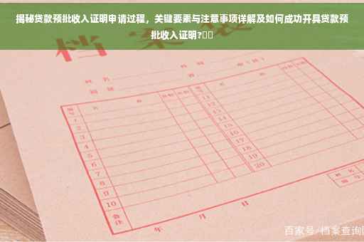 摘要:贷款预批收入证明是申请贷款过程中的重要环节,涉及关键要素和注意事项。本文将为您揭秘如何开具贷款预批收入证明,包括收入证明的主要内容、注意事项以及申请过程中的关键要素。阅读本文,您将了解如何顺利开具收入证明,提高贷款申请成功率。