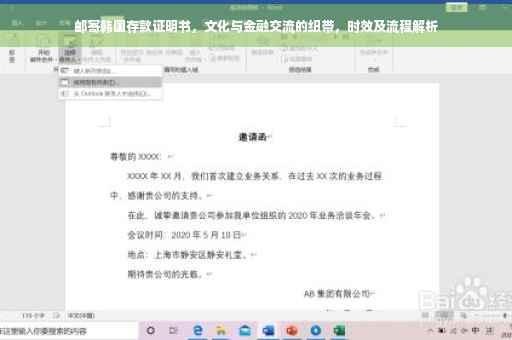 摘要:邮寄韩国存款证明书是文化与金融交流的重要纽带,对于促进国际间的资金流动具有重要意义。该过程涉及将存款证明文件通过邮寄方式送往韩国,具体时长因邮寄方式和地区差异而异。了解邮寄时间和相关流程,有助于确保金融交易的顺利进行,并加强跨国文化交流。