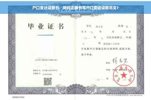 摘要:户口变迁证明书是用于证明个人户口迁移情况的正式文件。其范文应包括以下内容:标题为“户口变迁证明书”,接着写明被证明人的基本信息,如姓名、身份证号等;接着描述户口迁移的具体情况,包括原户口地址、现户口地址、迁移时间等;最后由出具证明的单位或机构签字盖章,并注明日期。全文应简洁明了,字数控制在100-200字以内。