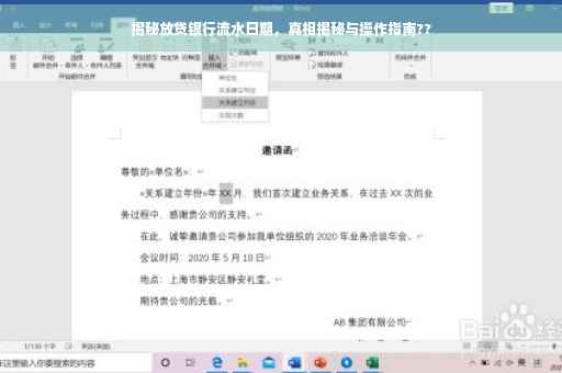 摘要:本文将揭示放贷银行流水日期背后的秘密,解读真相并给出操作指南。读者将了解如何计算放贷银行流水日期,以及背后隐藏的关键信息和注意事项。通过阅读本文,借款人可以更加明智地处理银行流水信息,提高贷款申请成功率。