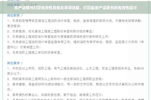 摘要:,,本文详细解析了资产证明书的打印有效性及相关事项。文章指出,资产证明书作为一种证明个人或组织资产状况的文件,其打印件的有效性取决于多个因素,包括打印件的清晰度、原件的真实性以及是否符合法定要求等。文章还介绍了如何确认资产证明书的有效性,以及打印过程中需要注意的事项,为读者提供了宝贵的参考信息。